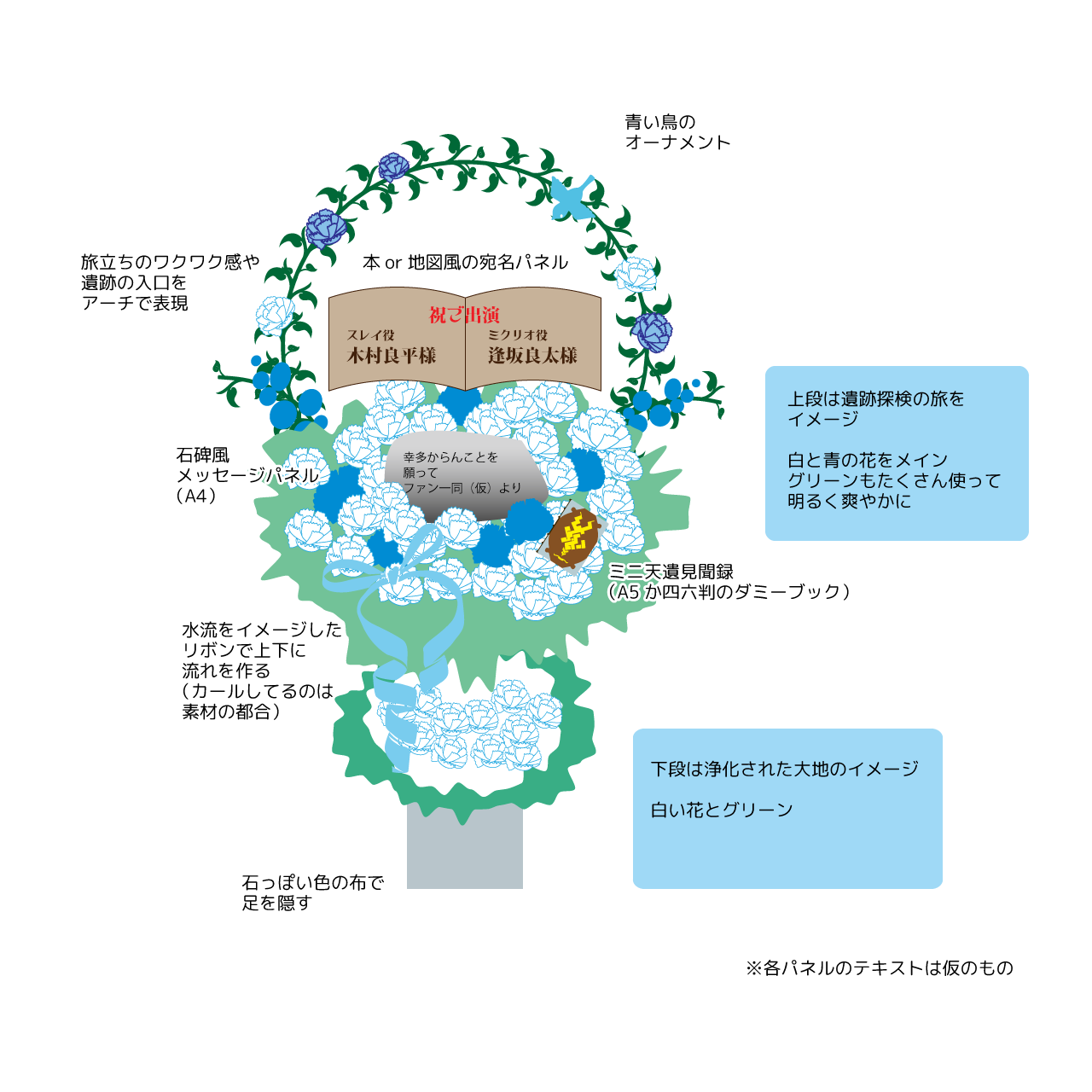 (パネルのデザインや小物・お花の希望の他、下段も遺跡っぽくしよう!など何でも)
